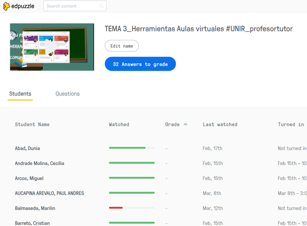 Como muchos conocerán, Edpuzzle es una herramienta que permite crear vídeos interactivos. Se selecciona un vídeo, se le agregan preguntas, mensajes o audios y el estudiante debe responder para continuar con la visualización del vídeo.