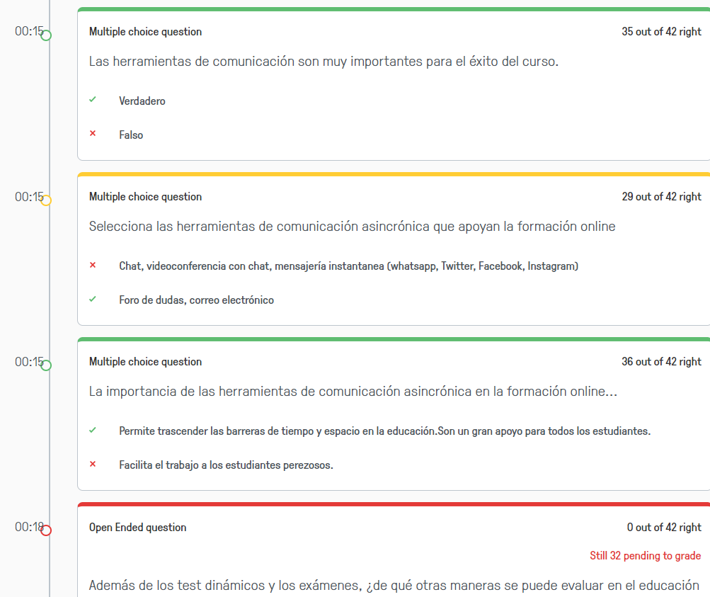 La herramienta ofrece estadísticas de aciertos por estudiantes y por preguntas, lo que le proporciona un feedback al profesor sobre la comprensión del tema y ofrece datos para la personalización de la formación.
