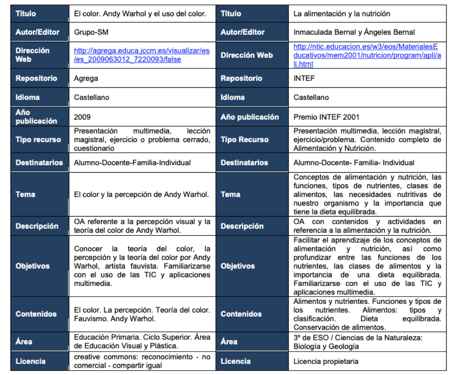 Con la muestra de los dos objetos elegidos, a nivel técnico y pedagógico, cada uno de ellos ofrece diferentes opciones que pueden ser válidas en función de los objetivos y el uso que de ellos se pretenda. Es decir, el primer recurso puede ser ampliado e integrado en diferentes opciones pedagógicas y contextos educativos; está abierto a iniciativas de otros docentes, hecho que nos permite aprovechar el recurso y reduce la inversión tanto temporal como económica. Mientras que el segundo recurso, se presenta como una opción pedagógica, que aunque sea cerrada, puede ser aplicable, siempre y cuando el docente se adapte a estos contenidos, pues no permiten la flexibilidad para ampliarlos y rediseñarlos, hecho que implicaría una mayor inversión temporal y económica.