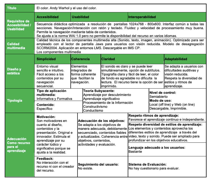 Una vez analizados los dos recursos de aprendizaje, consideramos que el recurso El color. Andy Warhol y el uso del colorcumple con una calidad tanto en el diseño como en la usabilidad, ya que técnicamente permite ser reutilizado a través de SCORM y ampliado en LMS hecho que permite construir nuevas experiencias de aprendizaje y su rediseño para adaptarse al contexto en el que va a ser utilizado. El diseño visual es muy intuitivo y agradable permitiendo su fácil acceso a los contenidos por su navegación de forma secuencial.