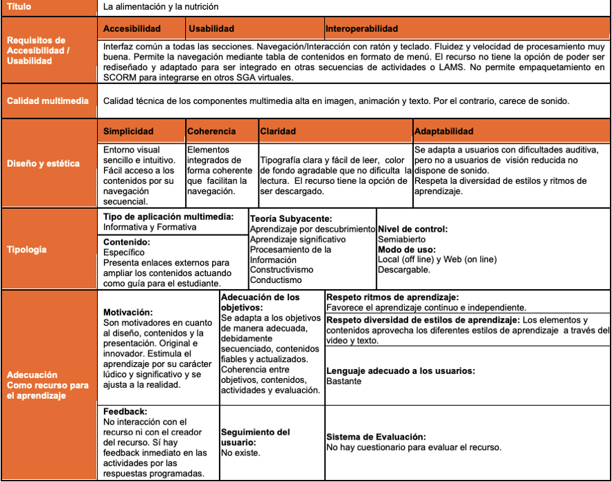 En referencia al recurso La alimentación y la nutrición, cumple con la calidad en el diseño ya que se puede navegar de forma intuitiva y amigable, pero pensamos que en cuestión de la reusabilidad presenta sus limitaciones, ya que técnicamente no puede ser integrar en otros escenarios educativos tecnológicos, tampoco puede ser rediseñado a través de SCORM, ni integrarse en LMS. Se presenta como una unidad didáctica de contenidos “cerrada en sí misma” que pueden ser trabajados de forma parcial o completa, ofreciendo links externos para ampliar la información, pero no se puede adaptar al contexto o situación que se requiera. En referencia a la atención a la diversidad, podemos decir que el recurso respeta el ritmo de aprendizaje de los usuarios, pero presenta limitaciones para atender algunas de las necesidades educativas especiales, puesto que no dispone de sonido y videos.