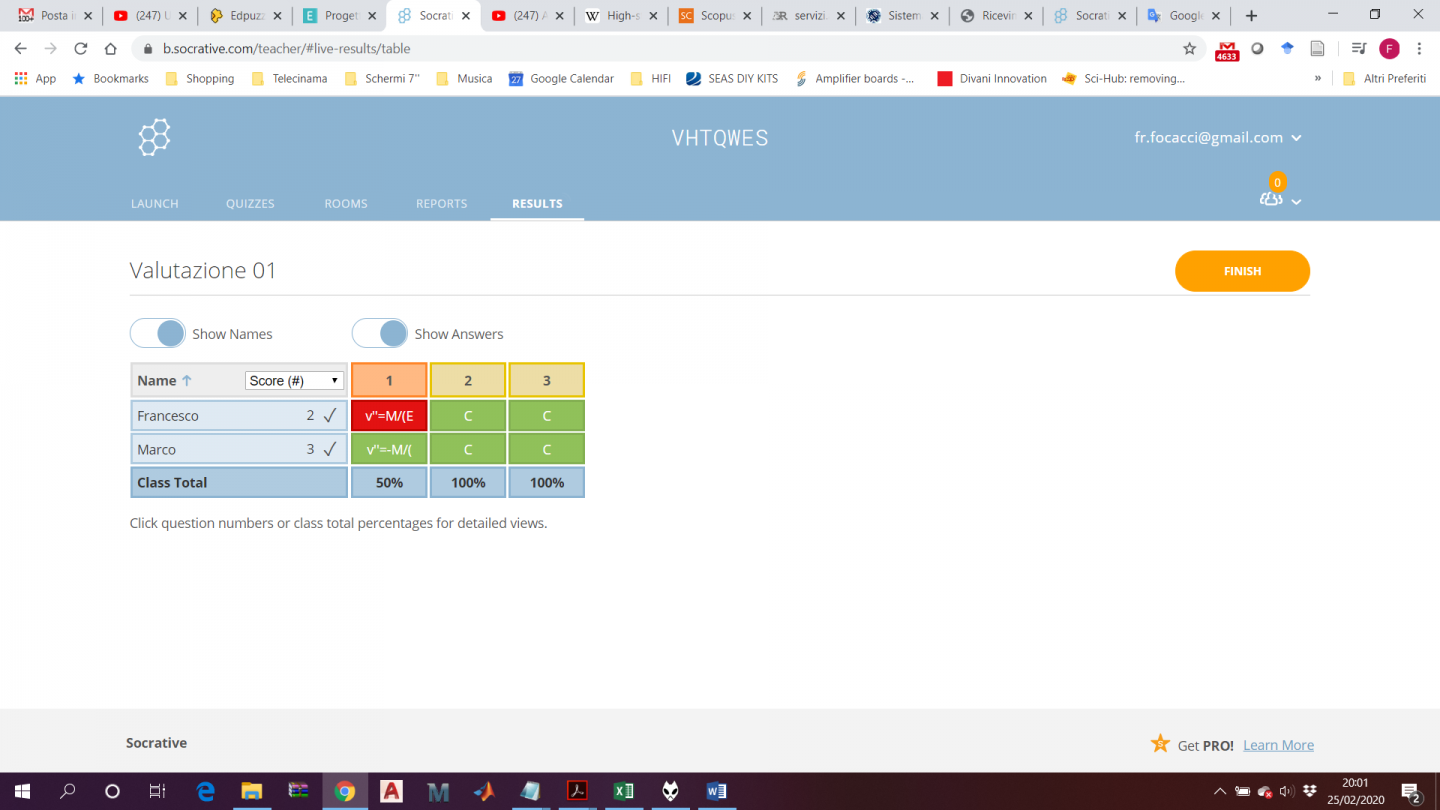 Riprendendo dal mio post precedente, ho provato a realizzare con Socrative una bozza di test da far svolgere durante lo studio, con l’idea della valutazione formativa. Per chi avesse voglia, il codice è VHTQWES. Sono solo tre domande, tanto per vedere come funziona lo strumento. Mi pare che questo nella versione free abbia veramente troppe limitazioni: va bene giusto per fare una prova. Ho cercato di congegnare le domande in modo da condurre passo passo alla soluzione di un esercizio. Molto bello il fatto che si possano vedere i risultati in tempo reale, con il dettaglio delle risposte giuste e sbagliate. Questo mi consentirebbe di individuare parti del corso non chiare o comunque di più difficile comprensione.