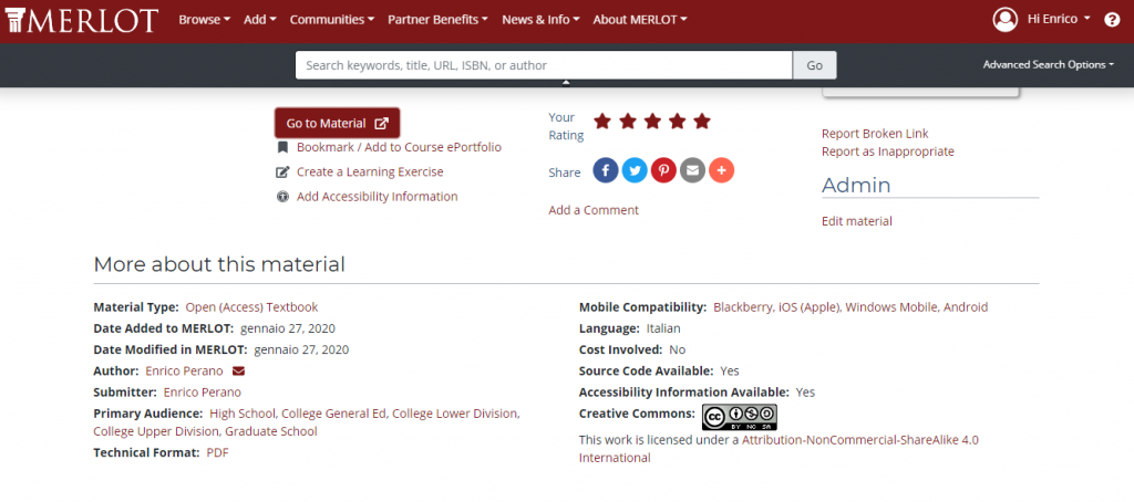Infatti, avendo conservato, in formato pdf, sei eserciziari di Elettrotecnica contenenti la risoluzione di temi d’esame per le facoltà di Ingegneria, della casa editrice Tecnos che ha ormai chiuso l’attività da qualche anno, ne ho inserito uno sul sito Merlot, come mostra la figura allegata. Ho scelto la licenza CC del tipo BY NC SA che permette di modificare o creare testi derivati dall’originale (BY), non a scopi commerciali (NC), riconoscendo sempre la paternità dell’autore e distribuendo l’eventuale nuovo lavoro con uguale licenza (SA).